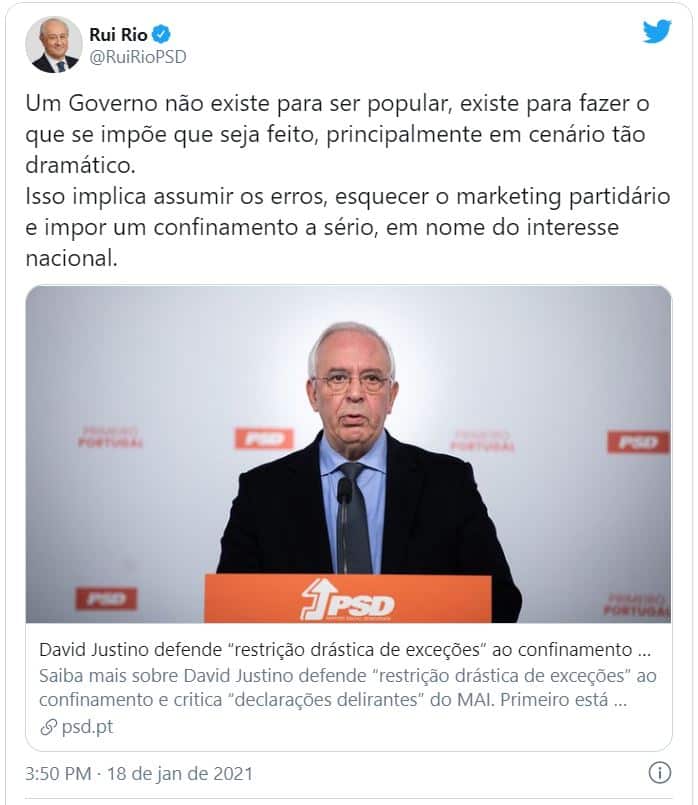 Rui Rio recorreu às redes sociais para fazer o apelo ao executivo de António Costa. "Um Governo não existe para ser popular, existe para fazer o que se impõe que seja feito, principalmente em cenário tão dramático. Isso implica assumir os erros, esquecer o marketing partidário e impor um confinamento a sério, em nome do interesse nacional", escreveu o líder do PSD.